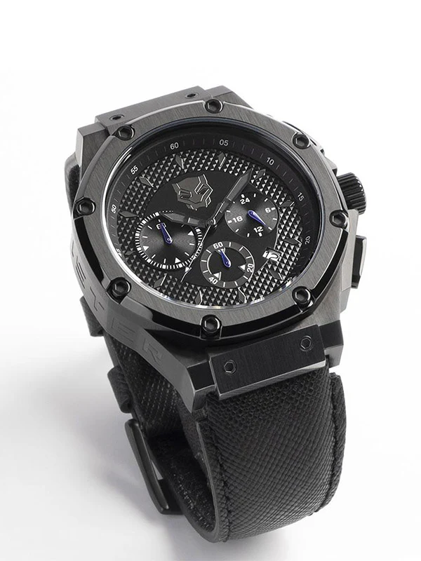Stay on Wakanda time forever with the new Black Panther watch. Made of all black brushed 316 stainless steel multi-piece case and six hexagon bolts. Featuring hour markers that resemble the Black panthers necklace and logo on the dial with carbon fiber outer track and purple accents. This watch is powered by a Japanese 6 hand chronograph Seiko Movement. Black panthers watch comes with a textured Italian leather interchangeable saffiano strap. Limited to only 100 pcs and individually numbered on the back.