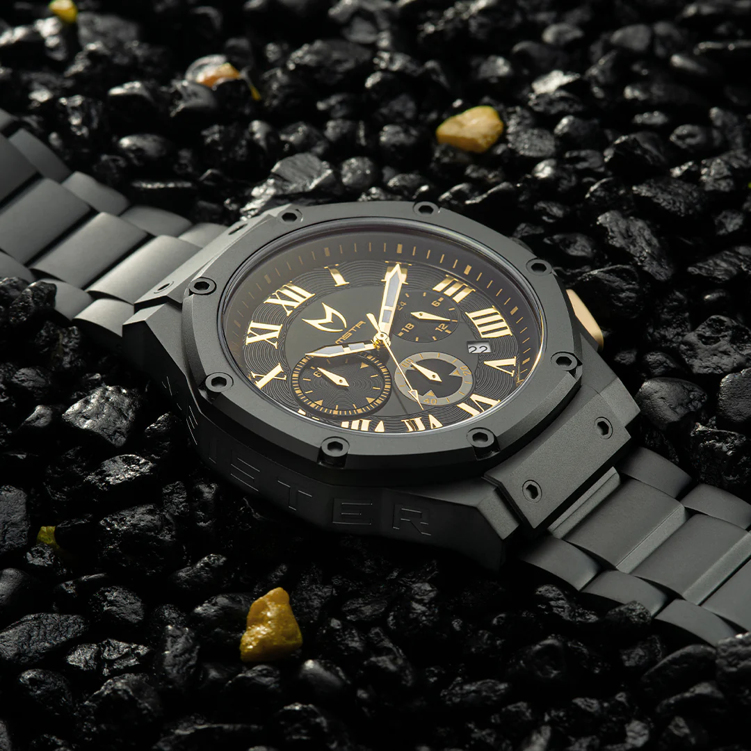 Warranty: 2 years limited warrantyThe Sandblasted Black & Gold Matte Ambassador is the newest addition to the MSTR Ambassador series. The flagship model of MSTR, all watches in the Ambassador series are made from 316L stainless steel and hence built to last. The all-new Sandblasted Black & Gold Matte Ambassador is limited to 100 pieces, each one individually numbered. The 6-hand chronograph watch powered by Seiko VD53 Japanese technology is protected by a scratch-resistant mineral crystal lens. Its signature hexagon bolt crown, pushers, and bezel come in sleek black with stainless steel casing in matte gold that perfectly complements the black. The stainless steel band can be interchanged with a leather strap and it will look just as impressive.