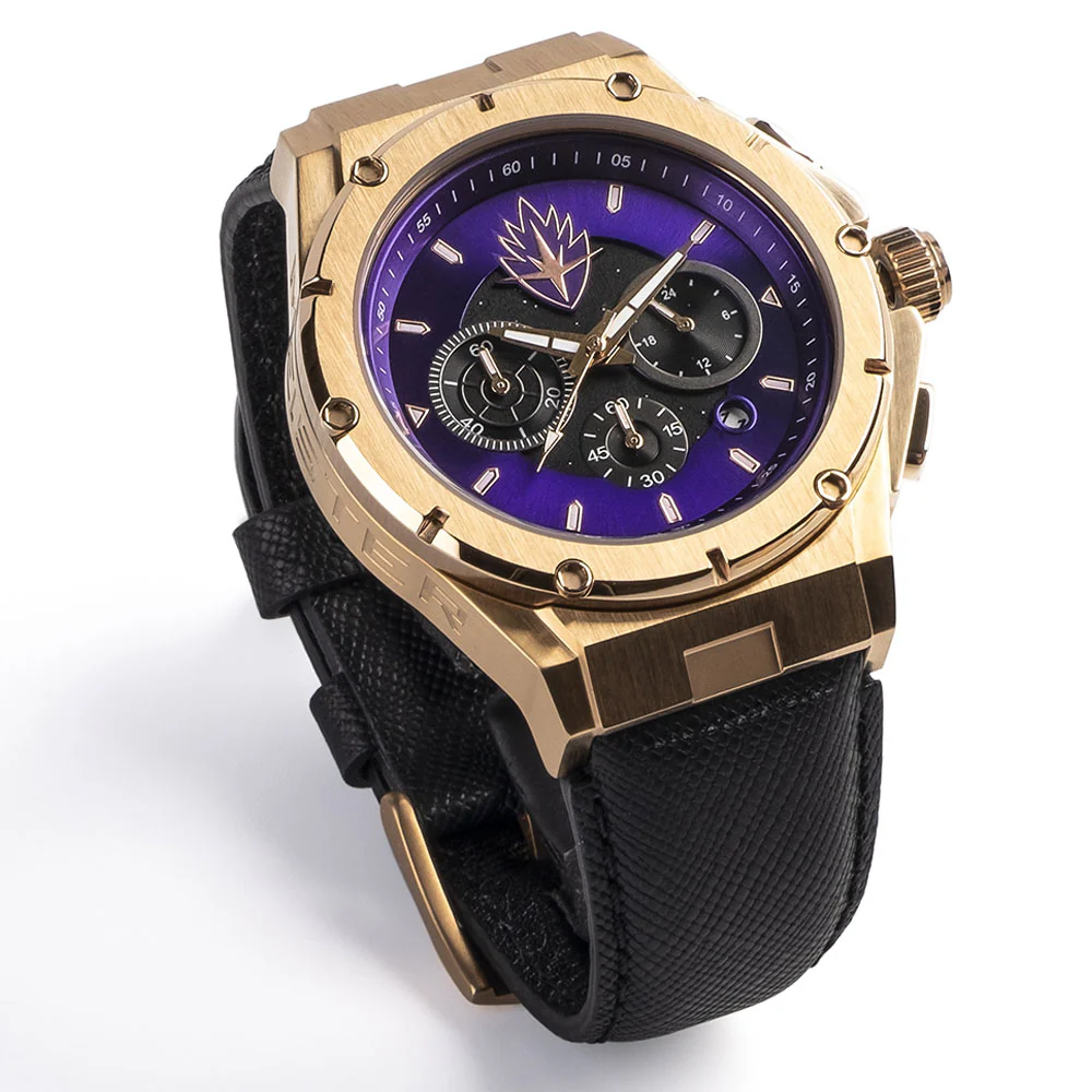 The guardians of the galaxy timepiece is here! This Mk3 ambassador has a brushed rose gold multi-piece 316 stainless steel case with six hexagon bolts and cuts on the bezel. Featuring the Guardians emblem with a reflective purple outer track and black space backdrop on the dial finished with gold glowing accent hour markers to match. This watch is powered by a Japanese 6 hand chronograph Seiko movement and has an interchangeable genuine Italian black leather saffiano strap. Limited to only 75 pcs and individually numbered on the back.