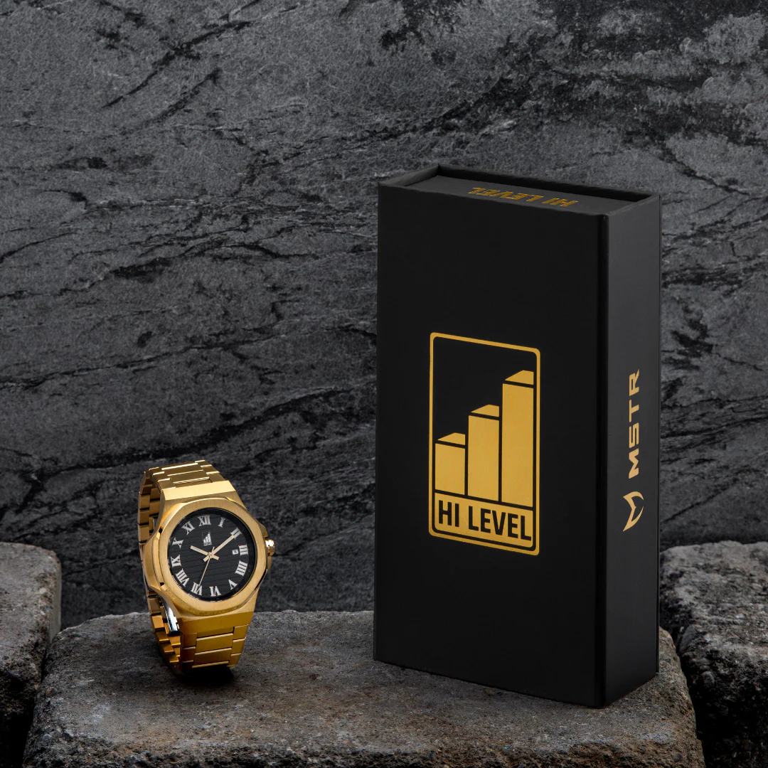 The Rose Gold and Black Steel Day Trip introduces an enduring elegance to our latest design in the MSTR collection. This piece is a homage to Gerald Genta's legendary craftsmanship, boasting a contemporary case forged from brushed silver NASA-Grade 316 stainless steel. It is distinguished by its bezel, which artfully combines brushed and polished finishes in a two-tone presentation. The dial captivates with a black ridged texture, highlighted by numerals and hands that glow with luminescence, encased in chrome outlines. A novel 3-link steel bracelet, embodying the updated design, comes equipped with the sought-after butterfly deployment clasp and screw-pin links for easy customization. Unique to this series, each Rose Gold Steel Day Trip watch bears a serial number engraved on the case back, with availability strictly limited to 100 pieces, ensuring its status as a collectible treasure.